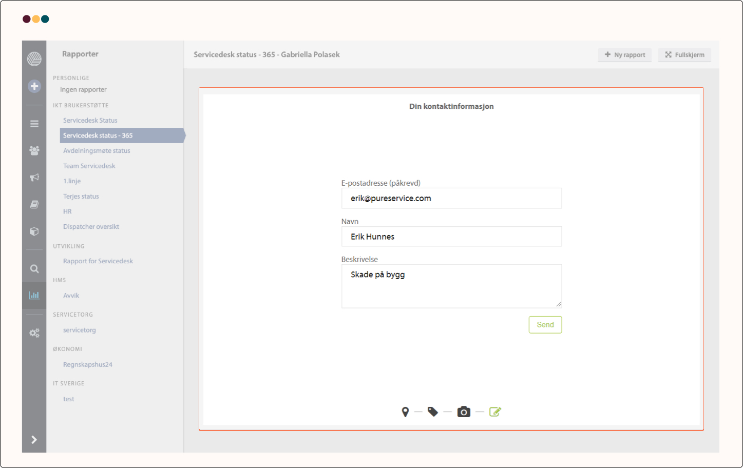 Det skal være enkelt for alle å melde inn henvendelser med informasjon om lokasjon med bilder som dokumentasjon. Mobilapplikasjonen er svært enkel, rask og brukervennlig. Trykk på en link på mobilen din og du er i gang med noen enkle steg for å registrere en feil, avvik, klage, bestilling eller henvendelse. Mobiltelefonen vet hvor den er, og du kan bruke kamera til å legge dokumentasjon rett i henvendelsen.