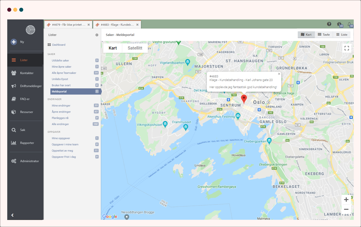 Som saksbehandler har du også tilgang til en fullverdig webapplikasjon for komplett oversikt over alle saker med filter (kategorier, statuser, type henvendelser etc.) i lister og kartvisning + knytninger til Ressurser hvis ønskelig.
