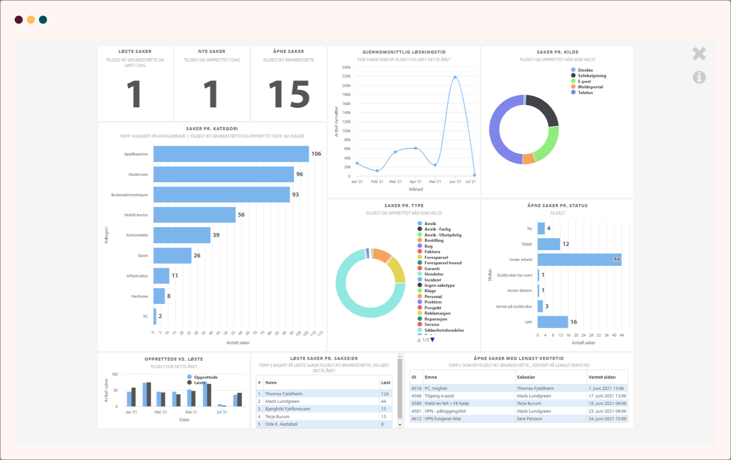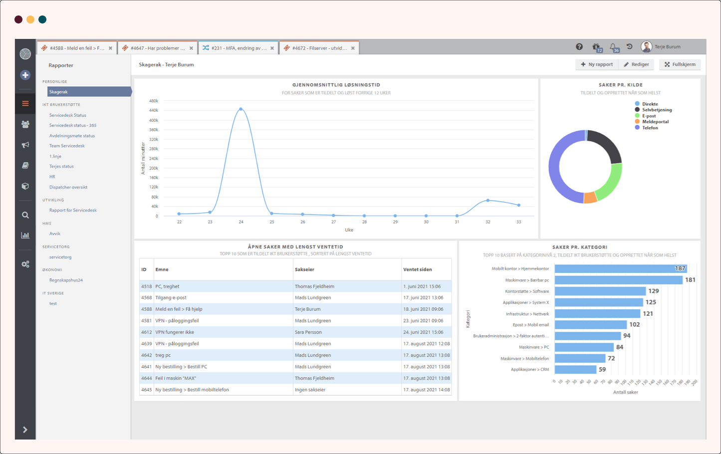 Pureservice har enkla och kraftfulla verktyg för att skapa värdefulla rapporter i servicedesken. Med Pureservice kan du skapa dina egna dynamiska och attraktiva rapporter med drag-and-drop av tabeller och grafer. Du kan enkelt filtrera och sortera den data du vill ha. På så sätt får du en skräddarsydd bild av vad du vill se och visa. Anpassa rapporterna efter din vardag och skapa dashboards med nyckeltal, grafer och listor.